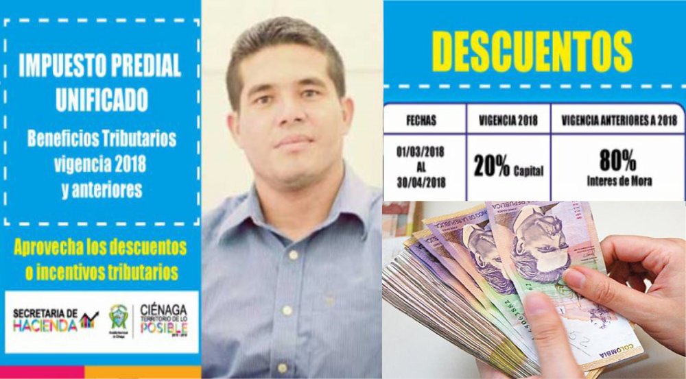 La secretaría de hacienda invita a la ciudadanía cienaguera a acercarse a realizar el pago del impuesto predial, aprovechando el mayor descuento que tiene vigencia hasta el 30 de Abril de 2018.