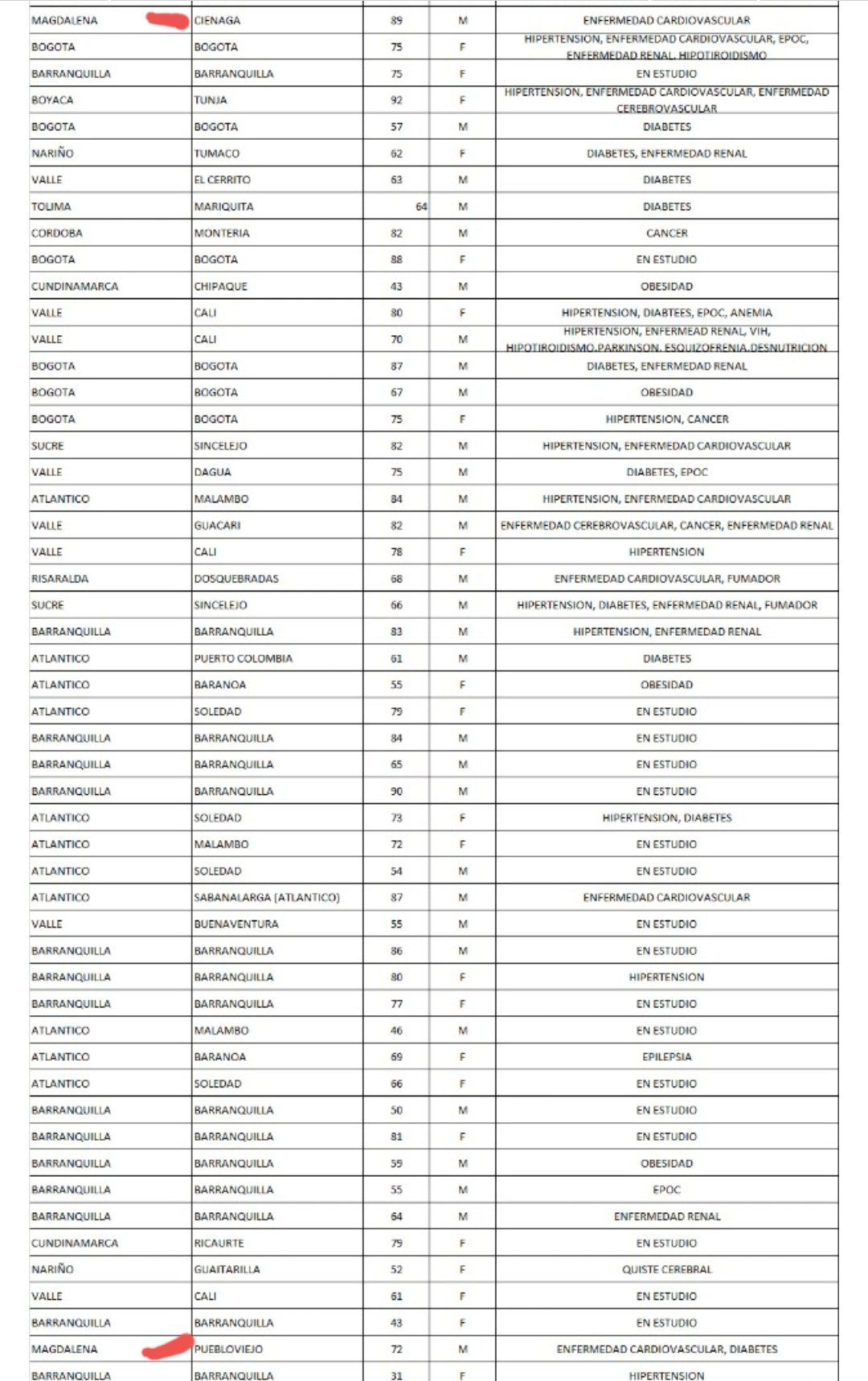 Así mismo, indica el informe que hay dos fallecidos en el Magdalena, dos adultos mayores, uno de ellos de 89 años, en Ciénaga, y otro de 72 años, en Puebloviejo, quienes padecían enfermedad cardiovascular.