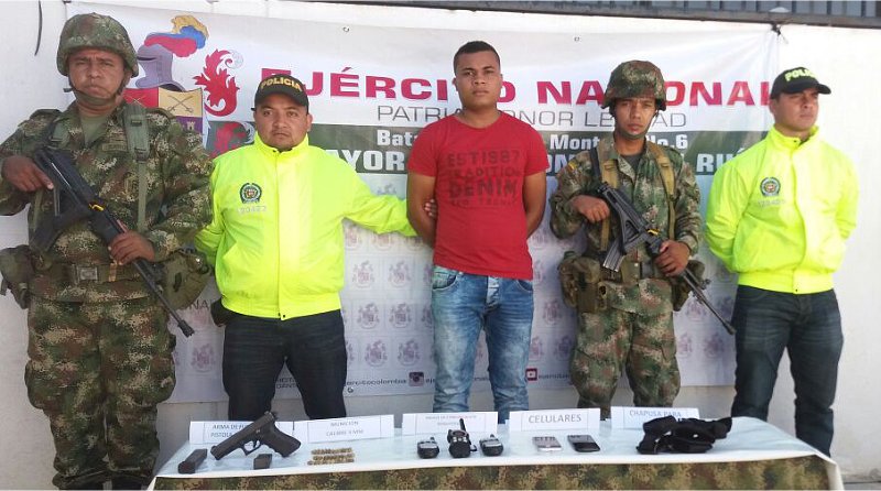 El capturado fue identificado como Dagoberto Palmera Polo de 24 años, oriundo de Santa Marta. Al momento de la captura, portaba una pistola marca Austria Glock calibre 9 milímetros sin número, 34 cartuchos calibre 9 milímetros, dos proveedores metálicos para pistola 9 milímetros, tres radios de comunicación y dos teléfonos celulares.