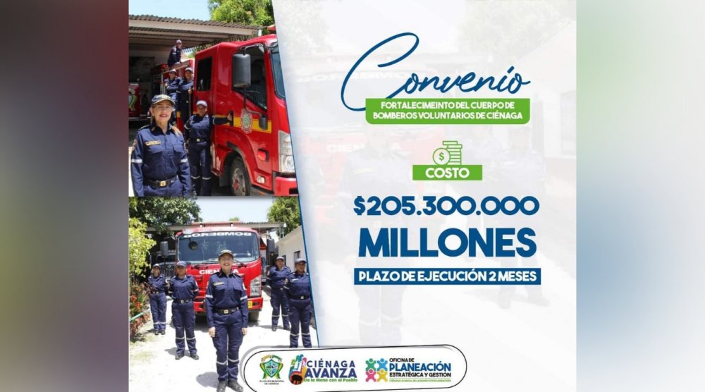 En cumplimiento de la Ley 1575 de 2012, y con la finalidad de seguir fortaleciendo el Cuerpo de Bomberos Voluntarios del municipio de Ciénaga, el alcalde firmó un convenio con la entidad, que tiene como objeto la compra de nuevos equipos y la capacitación de los integrantes de esta unidad, que presta servicio en el territorio.