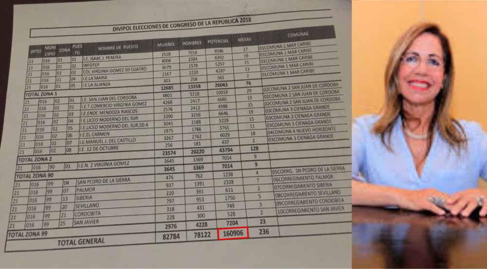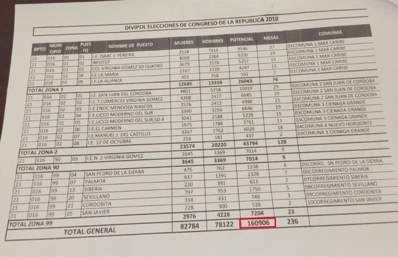 www.lalupacienaga.com.co revisó el documento presentado por la Registraduría a la secretaría de gobierno y realizando la sumatoria de los ítems, el dato real es de 84.055 ciudadanos aptos para votar y no 160.906 como registra el documento.