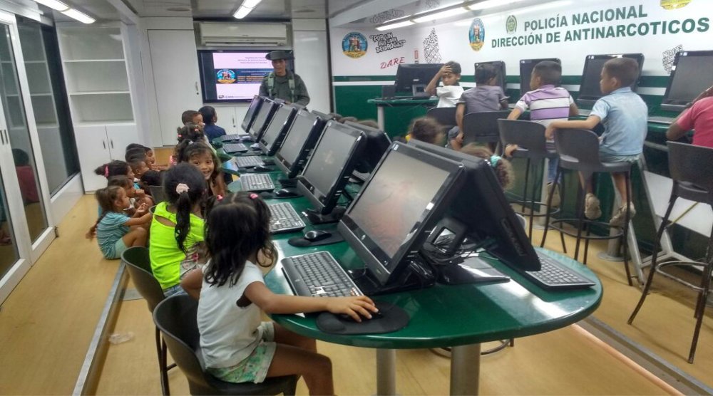 “El vehículo está dotado con 19 computadores y un televisor donde se proyectan videos, para que los niños interactúen a través del juego y la lúdica, les enseñamos cómo actuar ante momentos de riesgos», aseveró el suboficial.