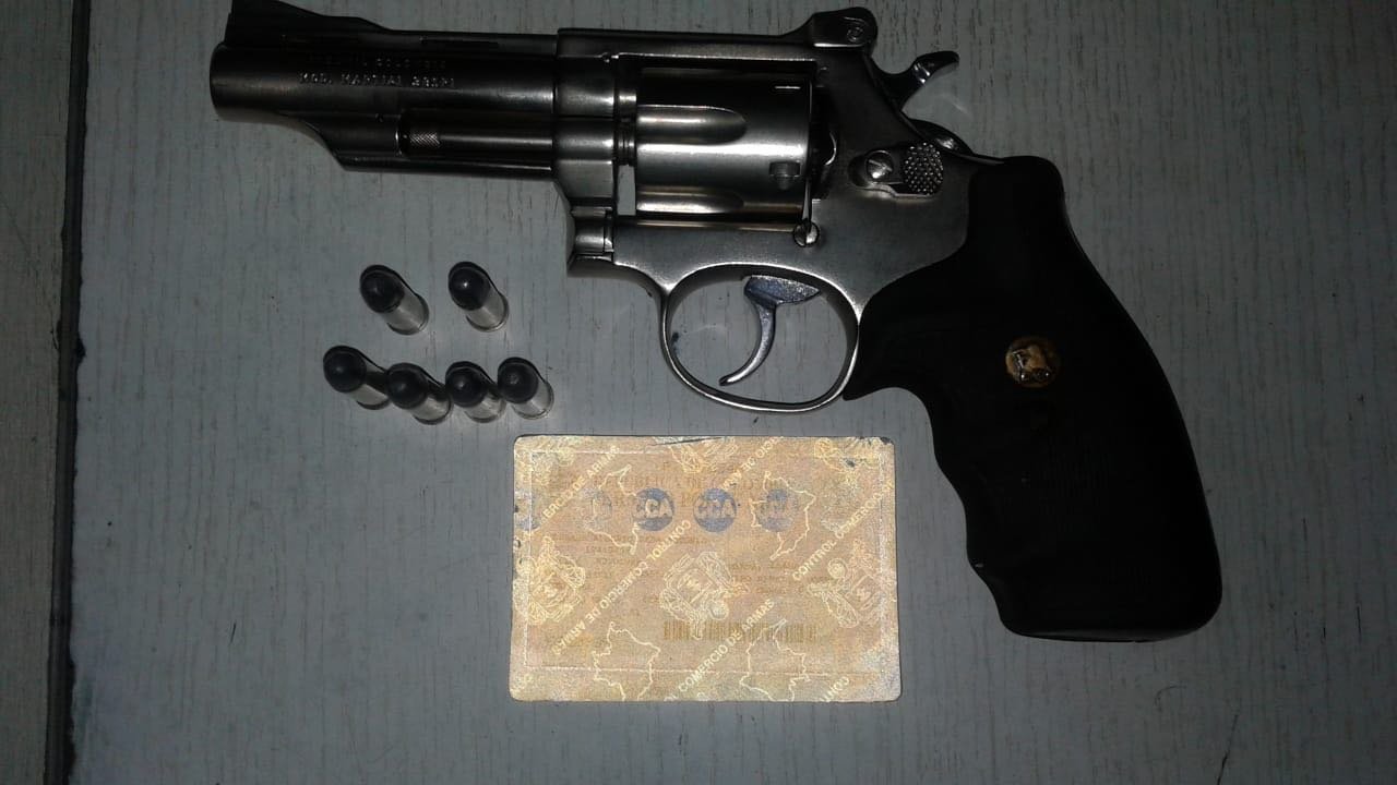 Al llegar al lugar de los hechos se ubica al ciudadano y se le práctica el registro hallándole en la pretina del pantalón un arma de fuego tipo revolver, marca Llama, calibre 38, número interno 04037, color plateado con 6 cartuchos en la recámara.