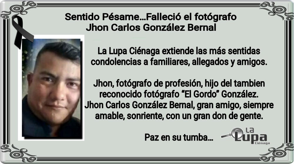 Read moreLa Lupa Ciénaga extiende las más sentidas condolencias a familiares, allegados y amigos. Jhon, fotógrafo de profesión, hijo del tambien...