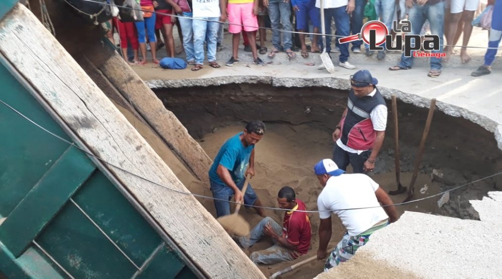 Un volteo cargado de arena de placa UGJ – 847, cayó en el gran cráter que se formó al colapsar el pavimento, dejando como saldo una persona herida que fue trasladada hasta una clínica de la ciudad.