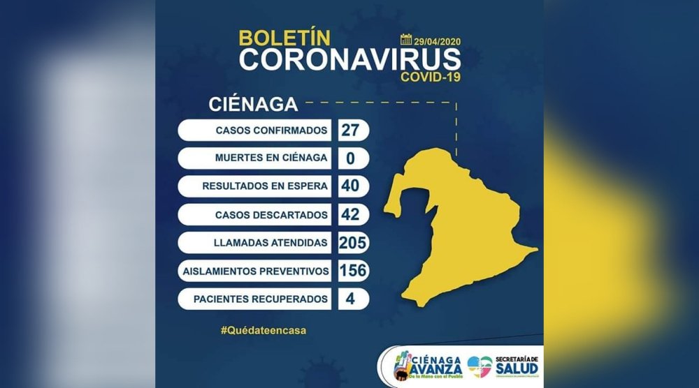 Estos casos confirmados por Minsalud se suman a los ya reportados por Alcaldía que maneja un dato oficial de 23 casos, por lo que hasta el momento habría un total de 27 casos positivos en Ciénaga.