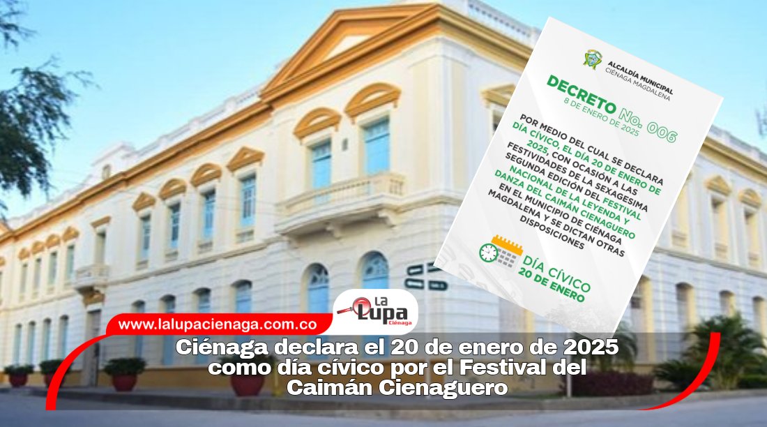 A través del Decreto No. 006 de 2025, el alcalde de Ciénaga, Luis Fernández Quinto, oficializó el lunes 20 de enero como día cívico en conmemoración de la sexagésima segunda edición del Festival Nacional de la Leyenda y Danza del Caimán Cienaguero.