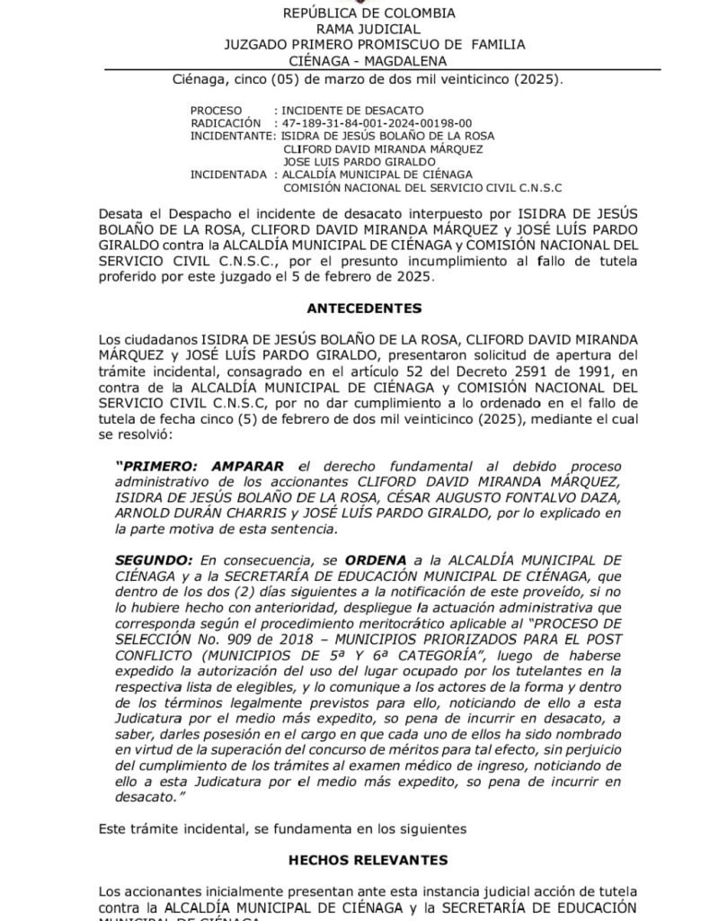 El Juzgado Primero Promiscuo de Familia de Ciénaga ordenó el arresto por cinco días y la imposición de una multa de cinco salarios mínimos al alcalde Luis Fernández Quinto, por incumplir un fallo de tutela que ordenaba el nombramiento de varios ciudadanos en cargos públicos tras haber superado un concurso de méritos.