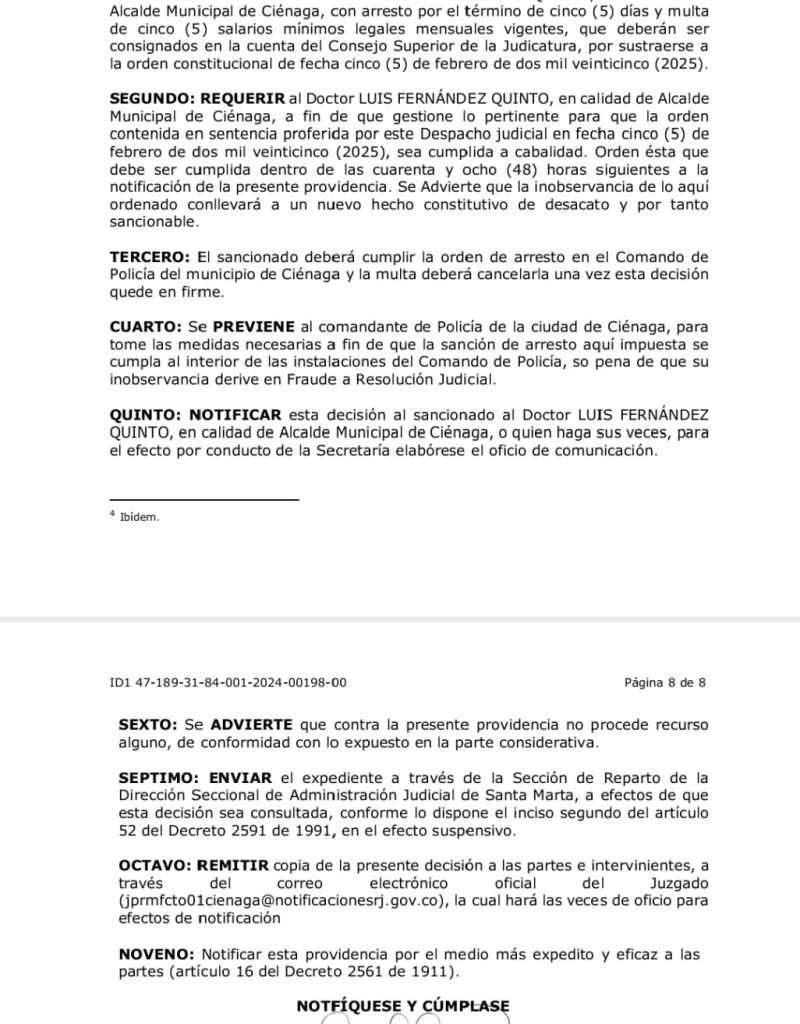 Como consecuencia, el alcalde deberá cumplir la orden de arresto en el Comando de Policía de Ciénaga, mientras que la multa será consignada en la cuenta del Consejo Superior de la Judicatura.