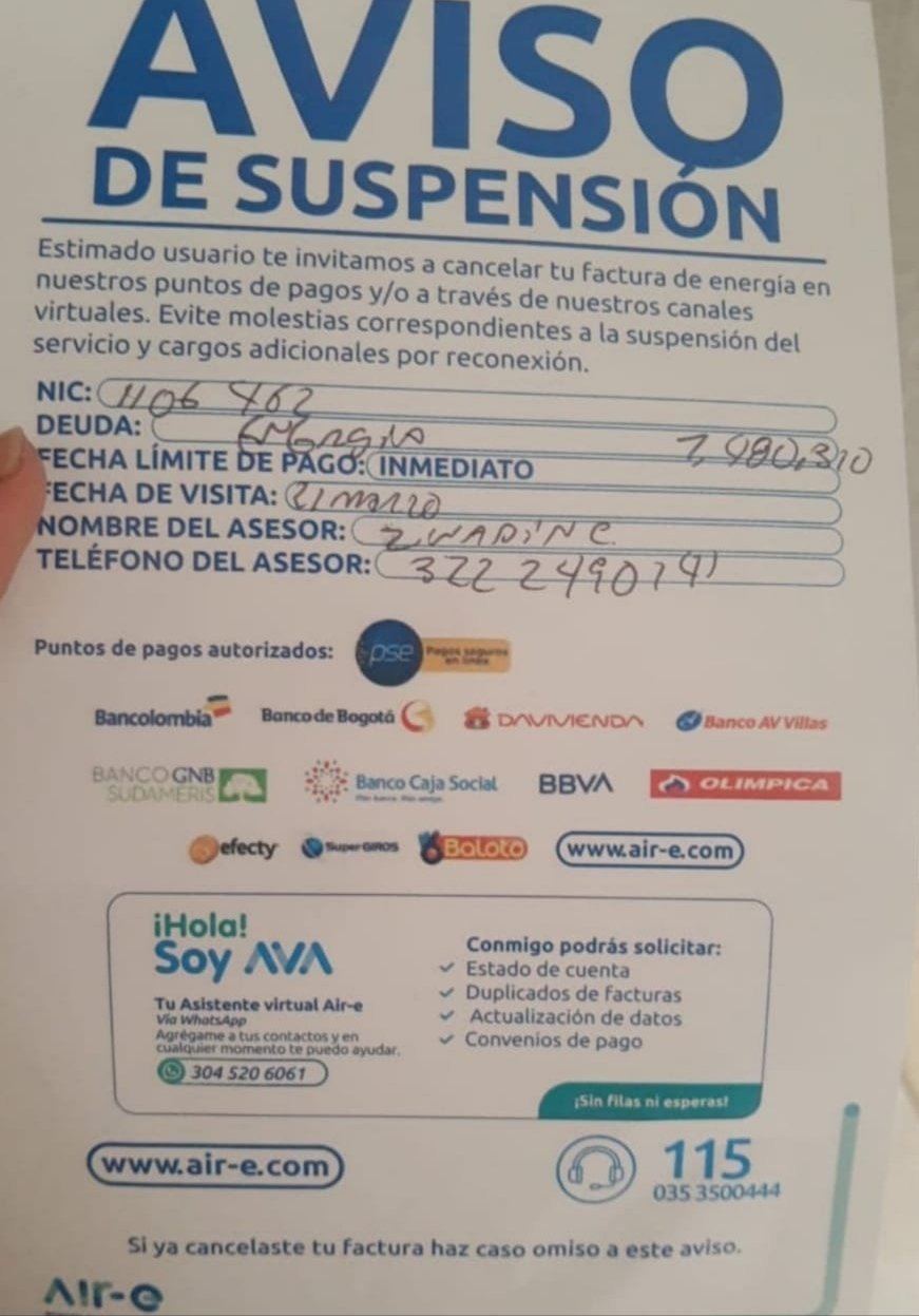 Adissa Acosta, explica que aún cuando se expidió una orden por parte de la Superintendencia de Servicios Públicos Domiciliarios para que la empresa Air-e retirara unos valores acordados con la extinta Electricaribe, siguen haciendo caso omiso a la orden dada y “torturan” recurrentemente a la usuaria con las cuadrillas de corte, en el inmueble ubicado en la calle 14 No. 17-81, barrio Centro.
