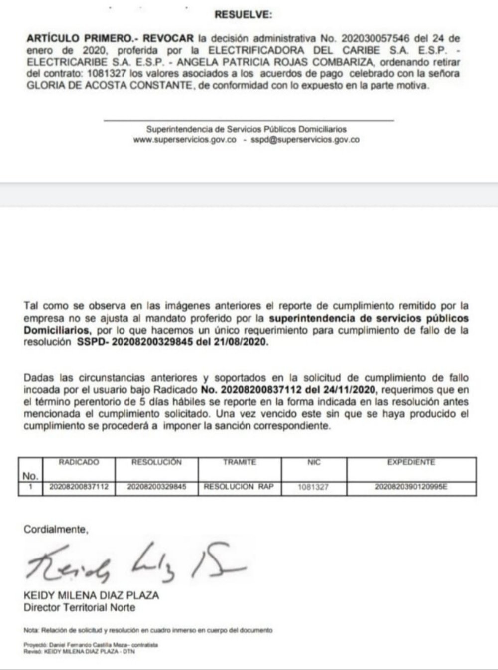 Asegura que se presentan a cualquier hora, en la mañana, en horas de almuerzo, y no reconocen la resolución de la Súper revocando la decisión administrativa proferida por Electricaribe, ordenando retirar del contrato los valores asociados a los acuerdos de pago celebrado con la señora Gloria de Acosta Constante.