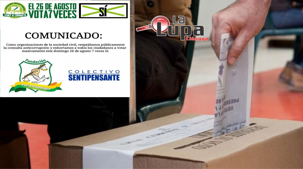 Cienaguero, ¡vota 7 veces sí! Plantea la propuesta del Colectivo Sentipensante y la Fundación por la Vida Digna en el municipio de Ciénaga, haciendo oficial el respaldo de esta organización no gubernamental ONG del municipio, en favor de la Consulta Anticorrupción.