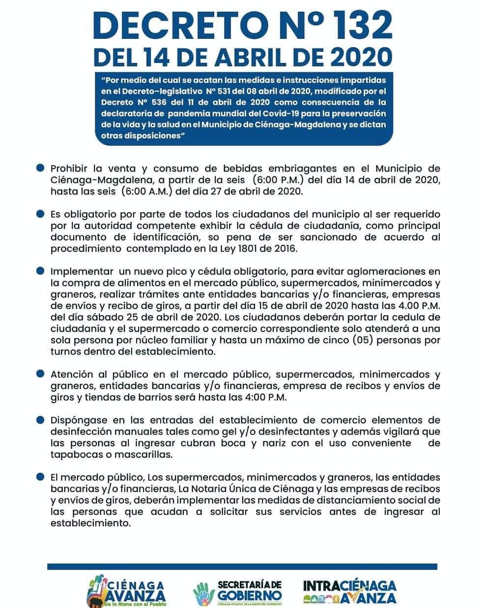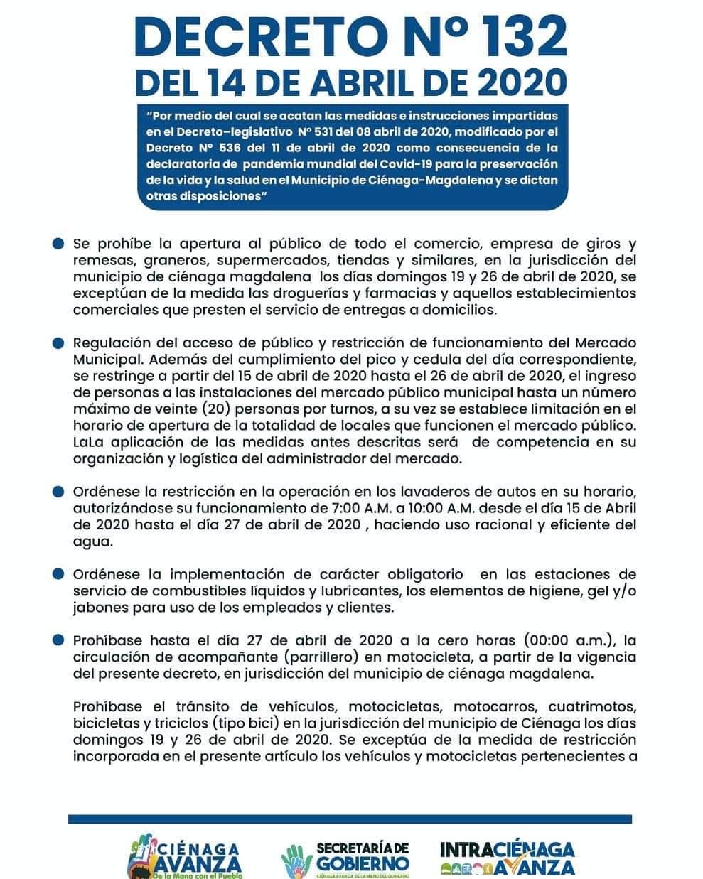 El acto administrativo que contempla estas medidas es el decreto No. 132 del 14 Abril de 2020 «Por medio del cual se acatan las medidas e instrucciones impartidas en el Decreto – legislativo N° 531 del 08 abril de 2020, modificado por el Decreto No. 836 del 11 de abril de 2020.