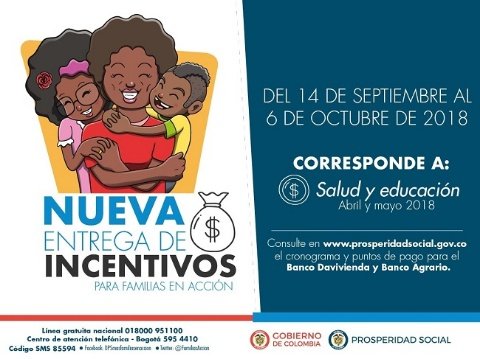 Garantizando la nutrición y permanencia escolar de los infantes y adolescentes del programa ‘Familias en Acción’, se desarrollarán los pagos del 14 de septiembre hasta el 6 de octubre del 2018 para los beneficiarios bancarizados (tarjeta débito) y los que cobran a través de la metodología de giro, correspondiente a los periodos ‘abril – mayo 2018’ en salud y educación.