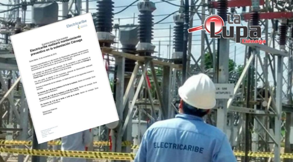 La energía eléctrica será suspendida por más de 10 horas, a partir de las 6 y30 de la mañana del domingo 18 de noviembre y retornará según la empresa a las 5 de la tarde**Técnicos especializados en alta tensión de Electricaribe realizarán mantenimiento preventivo a los equipos de la subestación Ciénaga para garantizar el correcto funcionamiento de los mismos y así un servicio de calidad.