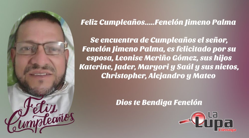 Se encuentra de Cumpleaños el señor, Fenelón Jimeno Palma, es felicitado por su esposa, Leonise Meriño Gómez, sus hijos Katerine, Jader, Maryori y Saúl y sus nietos, Christopher, Alejandro y Mateo