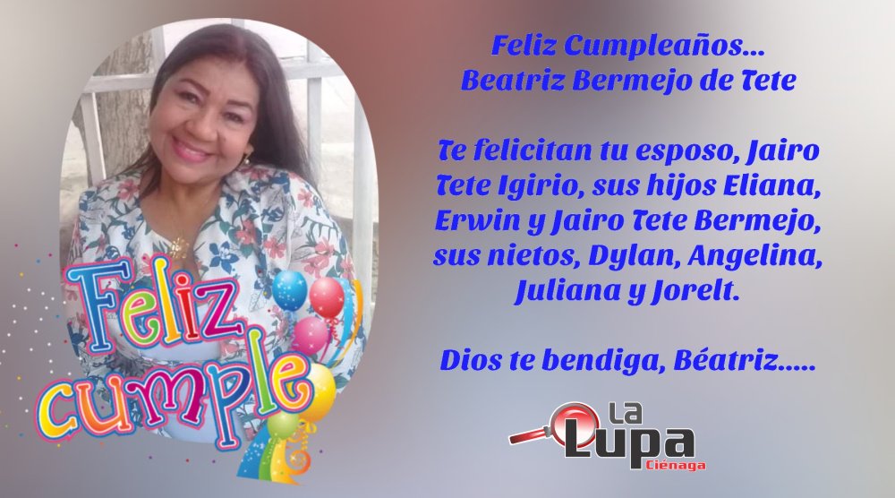 Te felicitan tu esposo, Jairo Tete Igirio, sus hijos Eliana, Erwin y Jairo Tete Bermejo, sus nietos, Dylan, Angelina, Juliana y Jorelt.