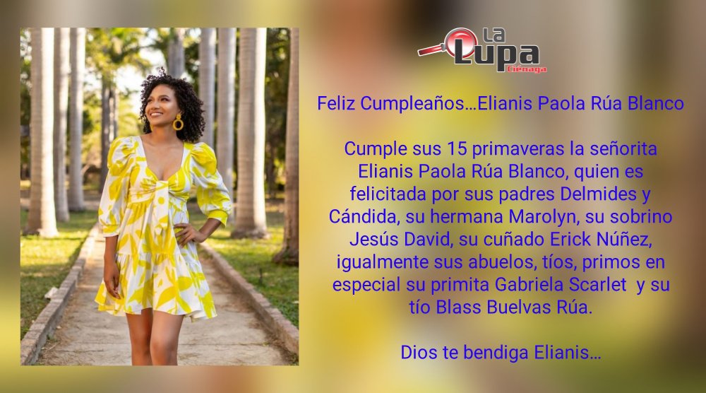 Cumple sus 15 primaveras la señorita Elianis Paola Rúa Blanco, quien es felicitada por sus padres Delmides y Cándida, su hermana Marolyn, su sobrino Jesús David, su cuñado Erick Núñez, igualmente sus abuelos, tíos, primos en especial su primita Gabriela Scarlet y su tío Blass Buelvas Rúa.