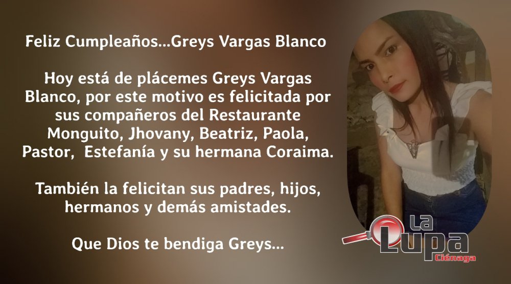 Hoy está de plácemes Greys Vargas Blanco, por este motivo es felicitada por sus compañeros del Restaurante Monguito, Jhovany, Beatriz, Paola, Pastor, Estefanía y su hermana Coraima.