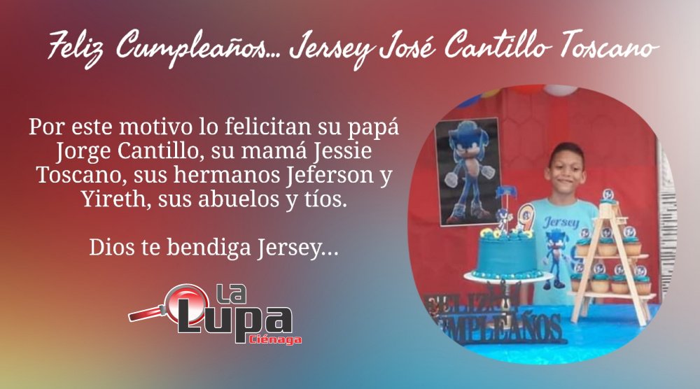 Por este motivo lo felicitan su papá Jorge Cantillo, su mamá Jessie Toscano, sus hermanos Jeferson y Yireth, sus abuelos y tíos.