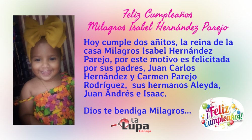 Hoy cumple dos añitos, la reina de la casa Milagros Isabel Hernández Parejo, por este motivo es felicitada por sus padres, Juan Carlos Hernández y Carmen Parejo Rodríguez, sus hermanos Aleyda, Juan Andrés e Isaac.