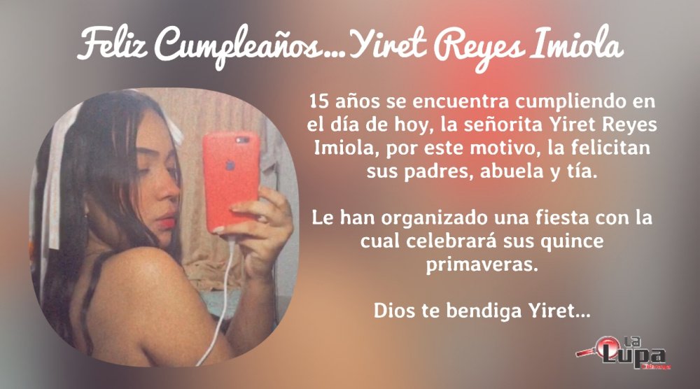 15 años se encuentra cumpliendo en el día de hoy, la señorita Yiret Reyes Imitola, por este motivo, la felicitan sus padres, abuela y tía.