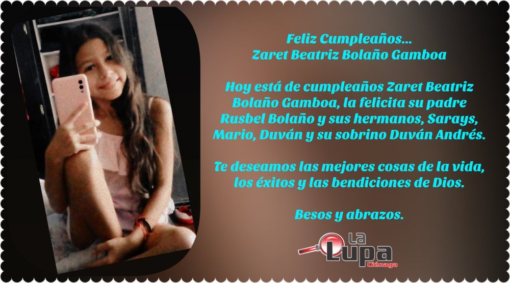 Hoy está de cumpleaños Zaret Beatriz Bolaño Gamboa, la felicita su padre Rusbel Bolaño y sus hermanos, Sarays, Mario, Duván y su sobrino Duván Andrés.