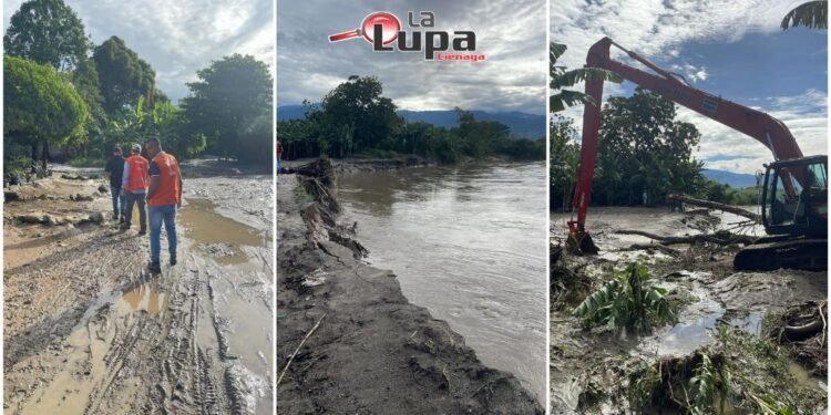 Con maquinaria amarilla se trabaja en las labores de reparación de los boquetes que abrió la creciente del río Sevilla en Zona Bananera. En seis municipios, de las subregiones Norte y Sur, hubo afectación de personas y cultivos por desbordamiento de afluentes.
