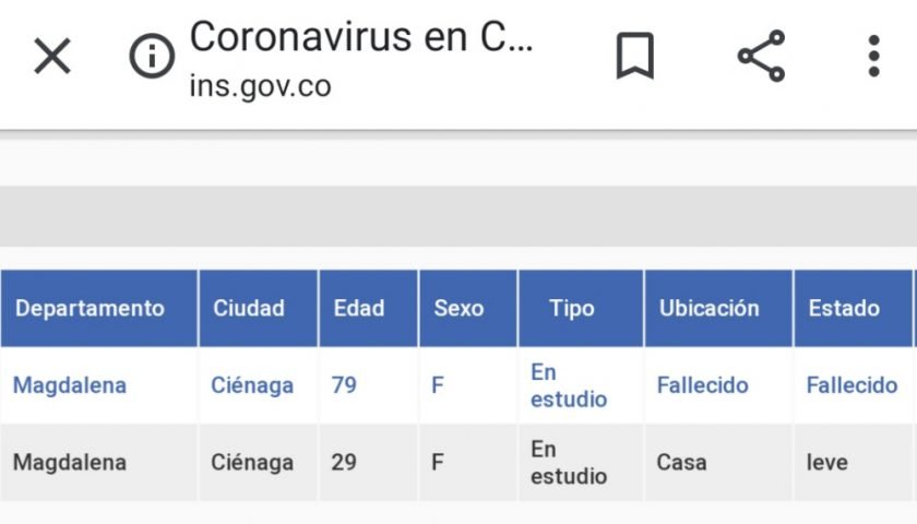 Ciénaga, según los informes de Minsalud ya reporta dos fallecidos por Covid 19.
