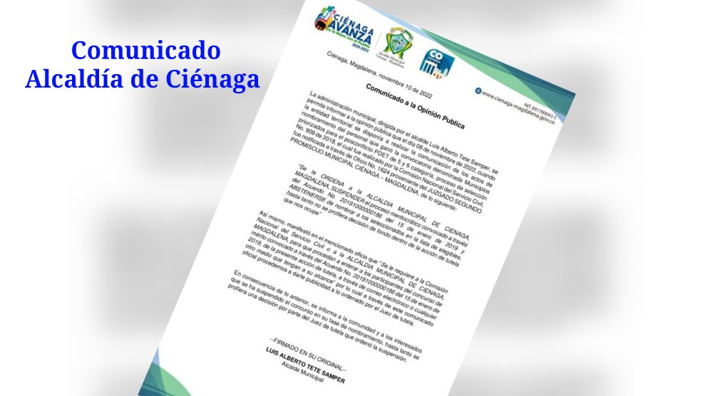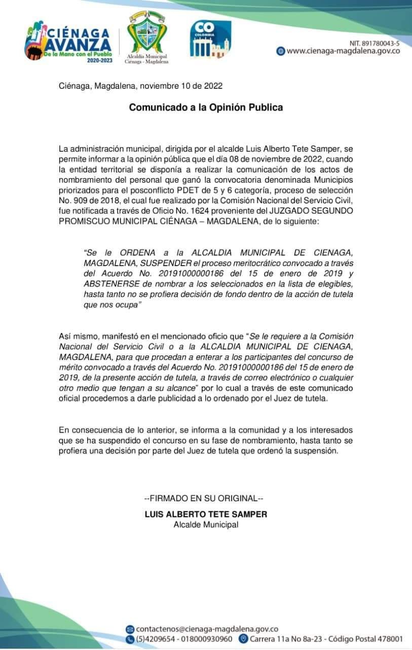 La administración municipal, dirigida por el alcalde Luis Alberto Tete Samper, se permite informar a la opinión pública que el día 08 de noviembre de 2022, cuando la entidad territorial se disponía a realizar la comunicación de los actos de nombramiento del personal que ganó la convocatoria denominada Municipios priorizados para el posconflicto PDET de 5 y 6 categoría, proceso de selección No. 909 de 2018, el cual fue realizado por la Comisión Nacional del Servicio Civil, fue notificada a través de Oficio No. 1624 proveniente del JUZGADO SEGUNDO PROMISCUO MUNICIPAL CIÉNAGA – MAGDALENA, de lo siguiente.