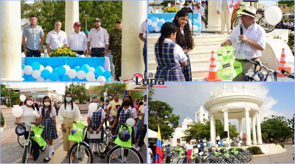 Las 57 bicicletas a niños y niñas de la I. E Virginia Gómez con alta vulnerabilidad y distancia del lugar de residencia, fueron entregadas por la Oficina del Alto Comisionado para la Paz de la Presidencia de la República y el alcalde Luis Tete Samper, con el acompañamiento del secretario de Gobierno Héctor Zuleta, la Gestora social Edna Gómez y el Consejo de Paz municipal de Ciénaga.
