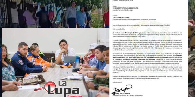 Jairo Pacheco Durán expresó: “Como PERSONERO MUNICIPAL recomiendo respetuosamente que la Alcaldía de Ciénaga Magdalena suspenda los permisos de obra otorgados al Consorcio Acueducto Ciénaga contratado por EDUBAR hasta que se realice una exhaustiva evaluación de sus prácticas operativas y se implementen medidas correctivas adecuadas para garantizar la seguridad y la integridad de las infraestructuras de agua potable en nuestro municipio.”