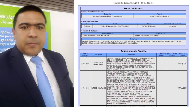 El texto de la actuación procesal colocada en la página del Tribunal Administrativo del Magdalena este jueves 18 de agosto sobre la demanda de nulidad del acto de elección del alcalde de la Zona Bananera Holmes Echeverría de la Rosa expresa lo siguiente: