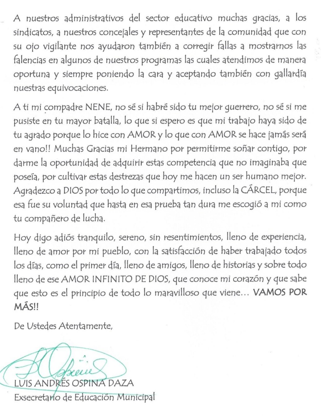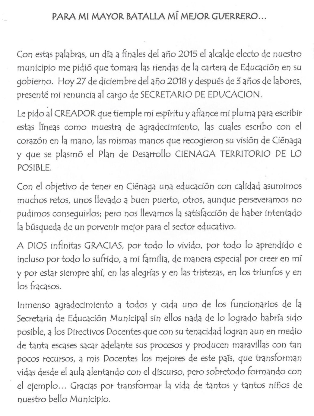 En oficio enviado al alcalde Edgardo Pérez Díaz, el funcionario expresa su decisión de renunciar al cargo de Secretario de Educación, el cual ocupa desde el inicio del gobierno, hasta el día 31 de diciembre del presente año.