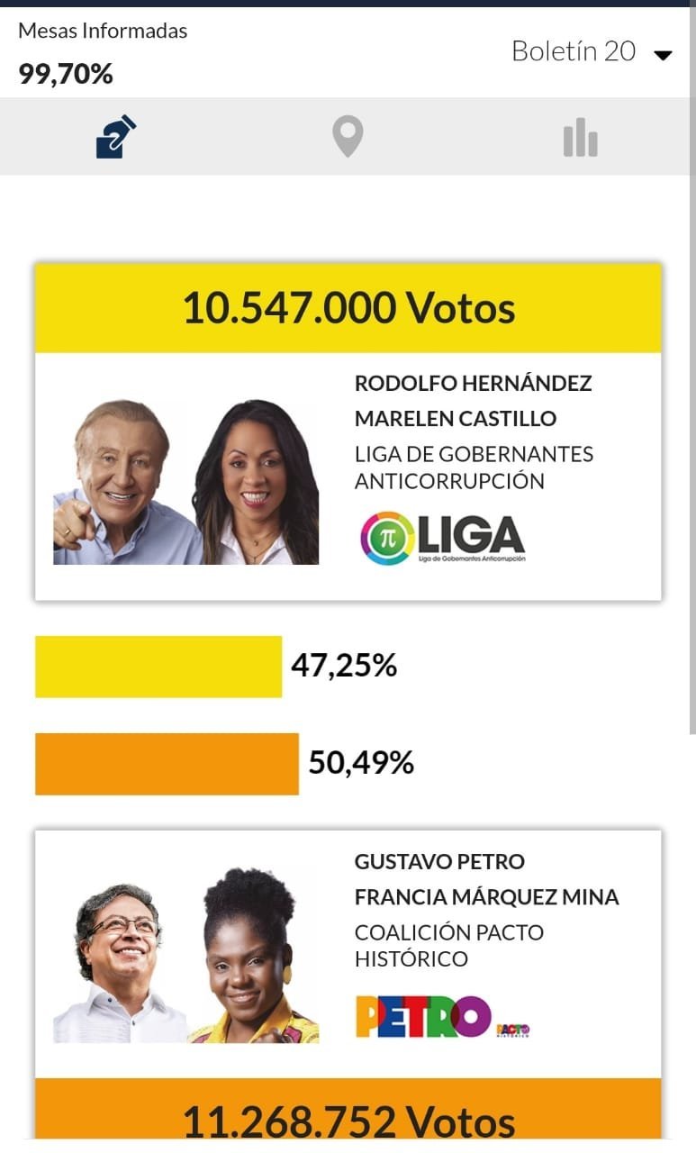 La diferencia a favor de Gustavo Petro con el 99.70% de mesas informadas es de 721.752 sufragios.
