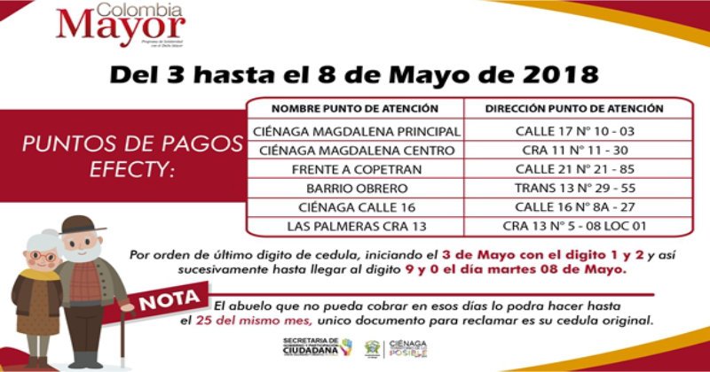 La Administración Municipal informa a la comunidad en general, y en especial a los abuelos que son beneficiados por esta iniciativa nacional, que el pago de la segunda cuota del programa «Colombia Mayor» 2018 en Ciénaga iniciará este jueves 3 de mayo.