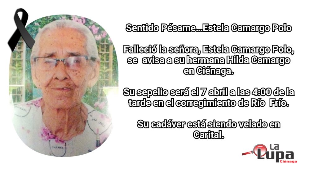 Falleció la señora, Estela Camargo Polo, se avisa a su hermana Hilda Camargo en Ciénaga.