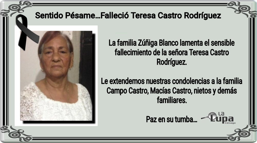 La familia Zúñiga Blanco lamenta el sensible fallecimiento de la señora Teresa Castro Rodríguez.