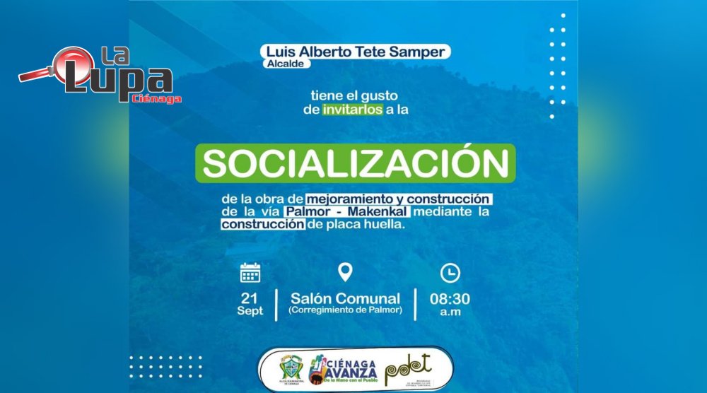 El alcalde, Luis Alberto Tete Samper, tiene el gusto de invitar a la comunidad cienaguera ubicada en la parte alta del municipio, a participar del acto de socialización de contrición de Placa Huella de la vía Palmor – Makenkal.