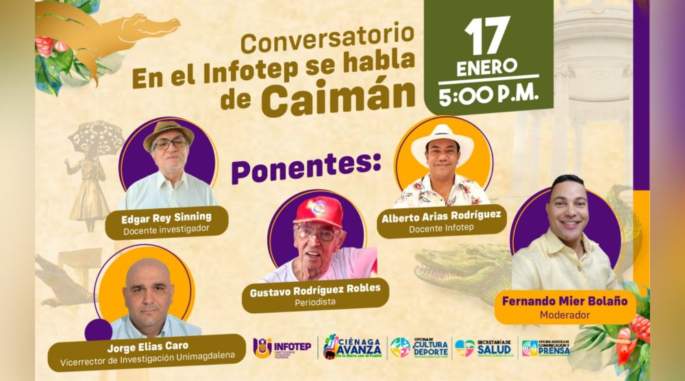El conversatorio «En el Infotep se habla de Caimán» iniciará a las 5:00 p.m. en el patio tropical de la Institución de Educación Superior, para lo cual contará en el panel con el sociólogo e investigador Edgar Rey Sinning, el Vicerrector de Investigación de la Universidad del Magdalena, Jorge Elías Caro, el periodista Gustavo Rodríguez Robles, el docente y director coreográfico Alberto Arias Rodríguez y el Comunicador Social Fernando Mier Bolaño, como moderador.