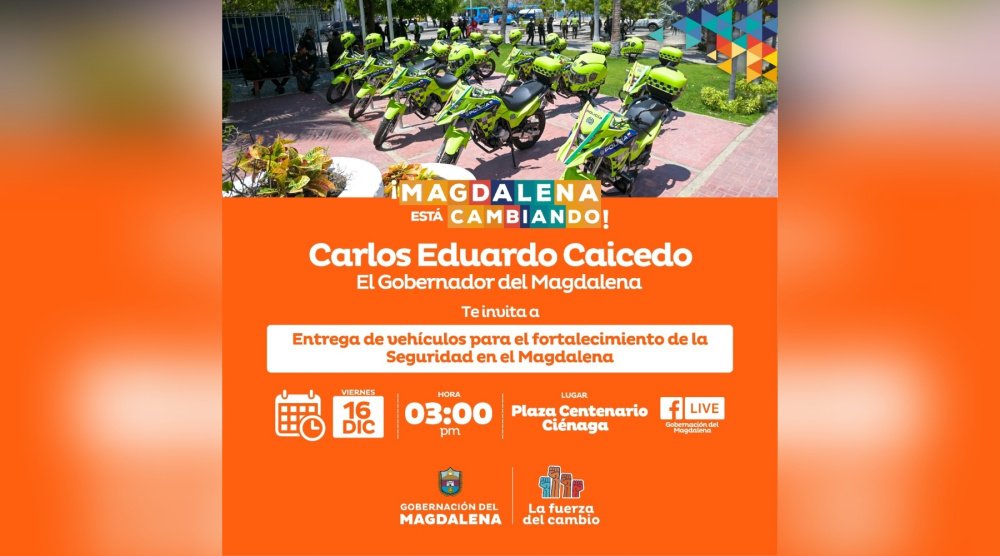 Acompáñanos en la Plaza Centenario de Ciénaga a la entrega de nuevos vehículos, que fortalecerán la seguridad en el Magdalena y mejorarán la capacidad de respuesta de nuestra fuerza pública.