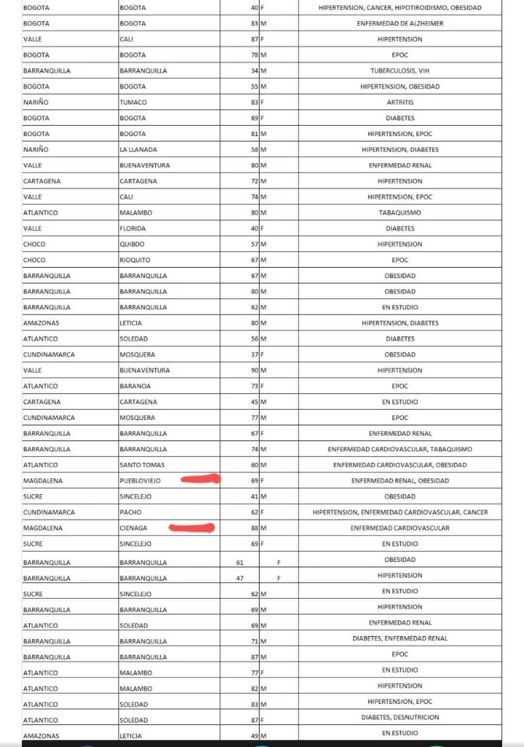 El informe del sábado 13 de junio «habla» de 47 nuevas muertes por Covid 19 en el país, y en Magdalena registra dos (2) fallecidos: un hombre de 88 años en Ciénaga, quien padecía de enfermedad cardiovascular y una mujer en Puebloviejo, de 69 años, con obesidad y enfermedad renal.